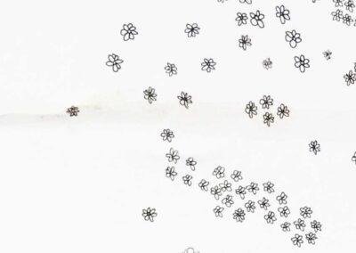In 2018 was ik begonnen aan een tekenwerk op groot formaat waarbij het herhalen van kleine bloemetjes het uitgangspunt was. Toen deze tekening ‘af’ was (deze hing in mijn atelier aan de muur), merkte ik na een aantal maanden dat de bloemetjes langzaam steeds lichter werden! Dit bleek door de zon te komen die er volop stond en ik balpen had gebruikt dat kwalitatief ook niet voldoende bleek te zijn. Ik moest deze tegenslag even laten bezinken maar nam dit proces al snel mee als een zegen, door een betere kwaliteit pen aan te schaffen wetende dat dit immers ook paste bij de kwaliteit van het leven waar dit werk voor staat en alle geduld te nemen om alle bloemetjes-vormen opnieuw over te trekken.